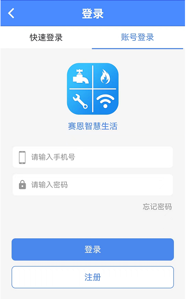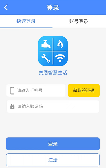 打開(kāi)智慧生活A(yù)PP,可以以“快速登錄”或“賬號(hào)登錄”兩種方式登錄。“快速登錄”需要輸入手機(jī)號(hào)、獲取驗(yàn)證碼之后,輸入驗(yàn)證碼直接登錄。“賬號(hào)登錄”需要輸入已注冊(cè)的手機(jī)號(hào)以及密碼進(jìn)行登錄。如圖