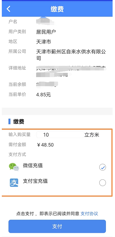 在繳費(fèi)之前請(qǐng)核對(duì)表具信息輸入購(gòu)買噸數(shù),支付方式支持微信和支付寶兩種方式。選擇輸入完畢之后點(diǎn)擊支付。如圖